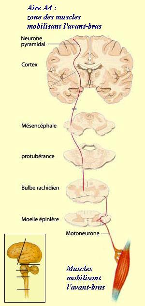 Lors de la contraction des muscles de l’avant-bras, l’influx nerveux proviendra d’un point précis de l’Aire A4. Ce point précis peut être localisé grâce à la représentation somatotopique des régions du corps correspondantes sur l’Aire A4 ou Cortex Moteur Primaire. C’est ce que l’on appelle également l’homoncule moteur de l’Aire A4.